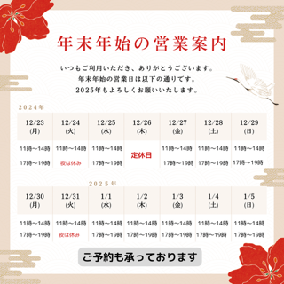 12月30日・31日 昼のみ営業11:00〜14:00